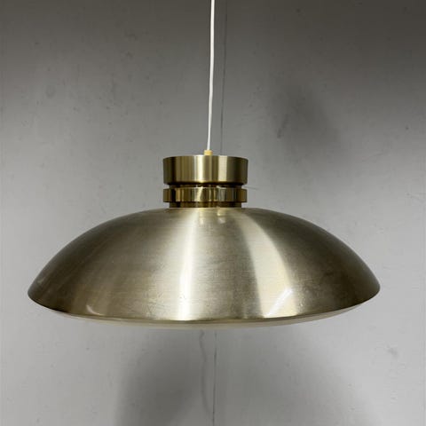 Pyöreät, kaarevat messinkisäleet renkaan muodossa, jossa on useita pieniä pyöreitä reikiä neliön muotoisessa muodossa. 2 mustaksi maalattua metallirengasta joissa messinkisäleet kiinni. E27 -kanta. Johdon pituus: 70 cm ( alkuperäinen). Korkeus: 18 cm Leveys: ∅ 50 cm .1960-1970-luku, modernismi.
