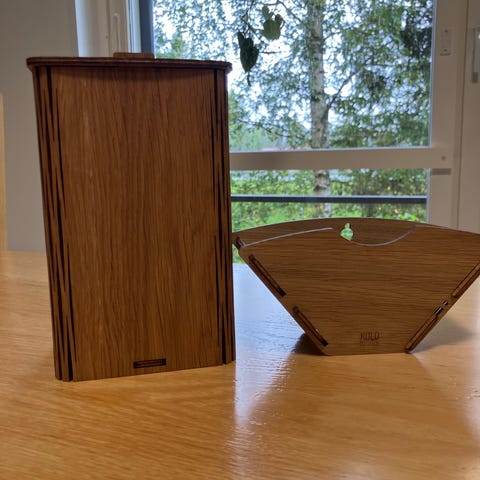 Koottava, puinen kahvirasia (500 g paketille) ja suodatinpussiteline (100 pussille).
