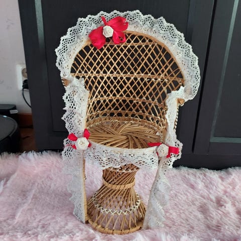 Riikinkukkotuoli nukelle tai koristeeksi. Rottinkipunosta. Ehjä. Savuton talous. Korkeus 21 cm, leveys 14 cm ja istuinkorkeus 8 cm. Sopii Barbielle tm. muotinukelle. Nouto ja käteismaksu tai ennakkomaksu ja postitus (10,90 eur). Ei mobilepay eikä toridiili.