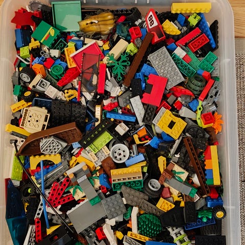 Läpinäkyvä laattikko täynnä harmaaita legoja sekasesti.