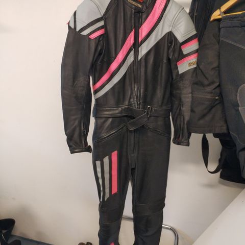 Nahkainen 2-osainen ajoasu, ei paikkoja suojille. Hieman käytön jälkiä, muuten siisti.