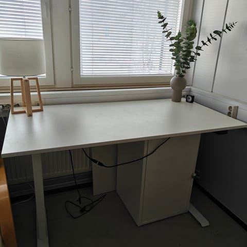 Työpöytä jossa näppäimistölle liukuva taso ja pöytäkoneelle paikka ja lukittavat 3 vetolaatikkoa.hyväkuntoinen. pöytätasossa kulumajälkeä.