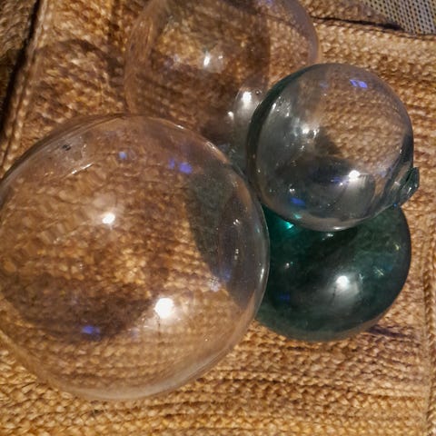 1970-luvun alussa antiikkiliikkeestä ostetut värilliset verkkopallot/verkonkohot alkuperäisissä naruverkoissa, ehjät ja hyväkuntoiset. Pallojen värit luumu, vihreä, punainen ja sininen. Pallojen halkaisijat n. 10 - 13 cm. Myydään kaikki yhdessä. Voi myös tarjota. Nouto ja posti.