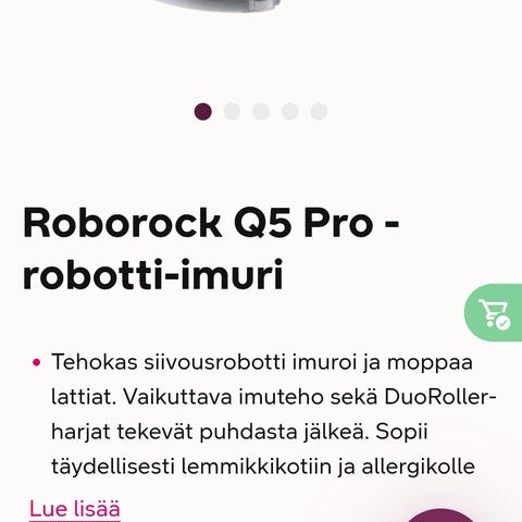 Ollut vähällä käytöllä, toimii moitteettomasti. Imuroi ja pesee lattiat. Pestävä suodatin.