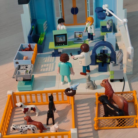Playmobilin lastensairaalasetti. Pakettiin kuuluu myös ambulanssi ja hammaslääkärisetti (pienemmät pussukat). Valtaosa alkuperäisosista tallessa, myös pienimmät. Ambulanssi toimii paristolla ja sekä ääni että valot pelaa. Tässä loistava leikkisetti seuraavalle leikkijälle!