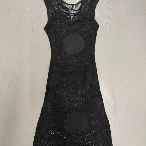 Upea Guessin musta pitsimekko. Selässä piilovetoketju. Koristeena purjerenkaita. Alushame. Erinomaisessa kunnossa, kerran käytetty.