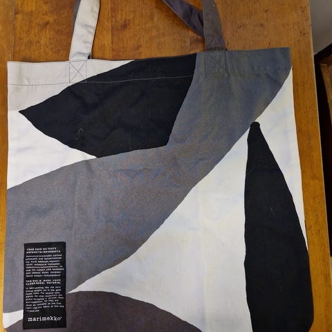 Marimekko kangaskassi, toiselta puolelta oikeinkin siistikuntoinen, toisella puolella pientä pintahaitua ja ”k” kirjaimessa hailua tahraa. Siistisilti mielestäni käyttöön.