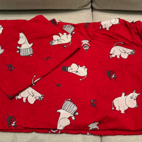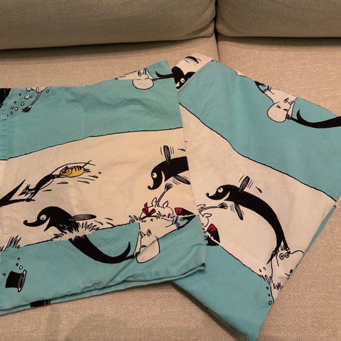 Finlaysonin Muumi-aluslakana vauvoille, koko 90×150 cm. Pesty hajusteettomasti. Hyvä kunto, ei reikiä tai tahroja (kuvassa rypyssä säilytyksestä).
