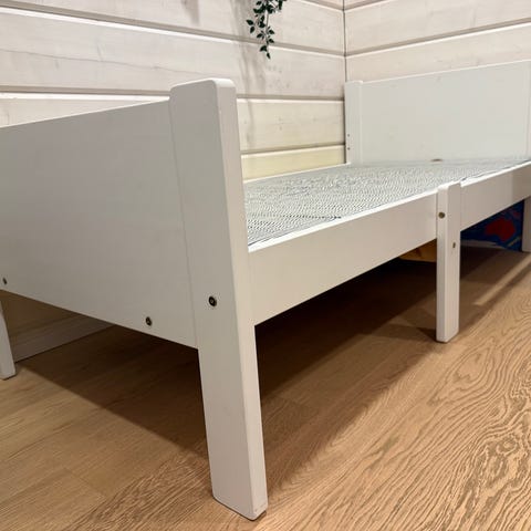 Varsin siisti valkoiseksi maalautettu puinen sänky, laidan irrotettava putoamissuoja 1 kpl ja pyörällinen lelulaatikko myydään hyvään kotiin. Pinnassa joitakin käytön jälkiä mutta ei väritahroja. Sälepohja täysin ehjä. Maalipinta periaatteessa hyvässä kunnossa mutta päätyjen uurteissa maali jonkin verran murentunut uurteen pohjalla reunassa (ks. viimeisin kuva).