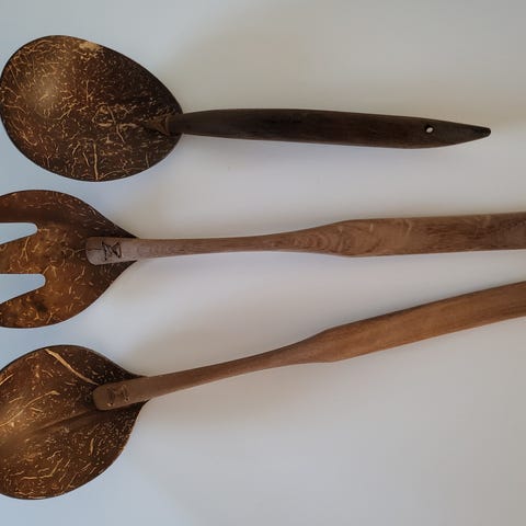 Kotimaiset iloisenpunaiset salaattipihdit. Valmistaja Karhumuovi, pituus 23 cm, materiaali elintarvikemuovia.