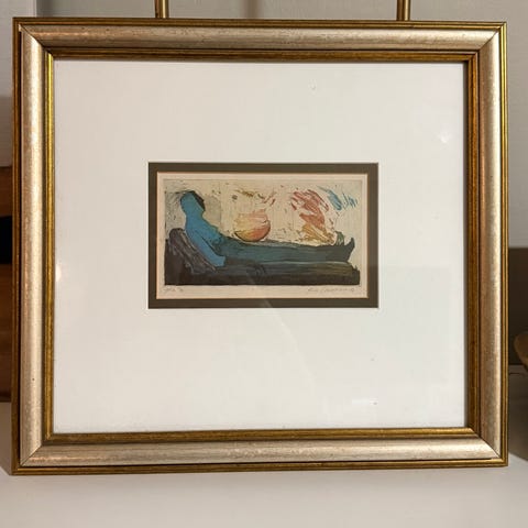 Anneli Keinonen "Mansikoille" serigrafia kankaalle mitat kehysten päältä korkeus n.42cm leveys n.42cm kuva-ala n.27x27cm