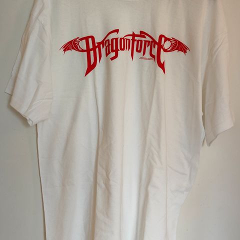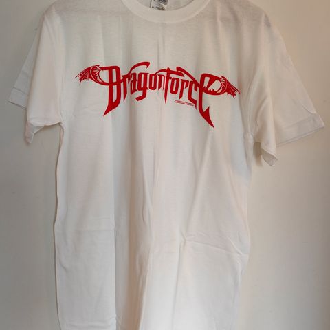 Musta Dragonforce t-paita, jossa etupuolella printti ja takapuolella Inhuman Rampage NA-kiertueen keikkapaikat. Uusi, käyttämätön ja aito fanituote.