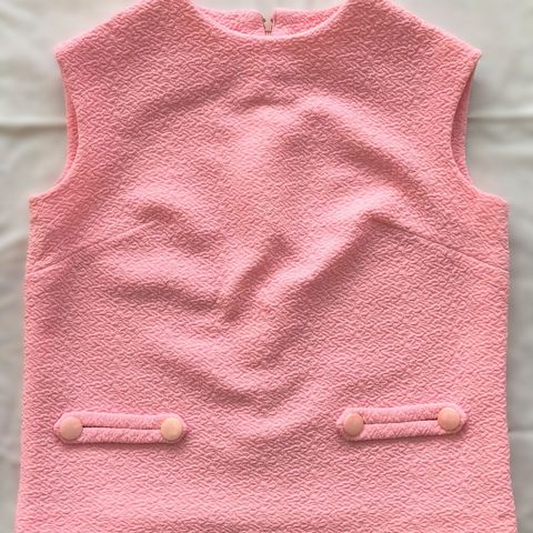 70-luvun pinkki lyhythihainen paita, jonka nappilistaa reunustaa laskokset ja röyhelö. Paita on malliltaan suora ja rennon väljä.