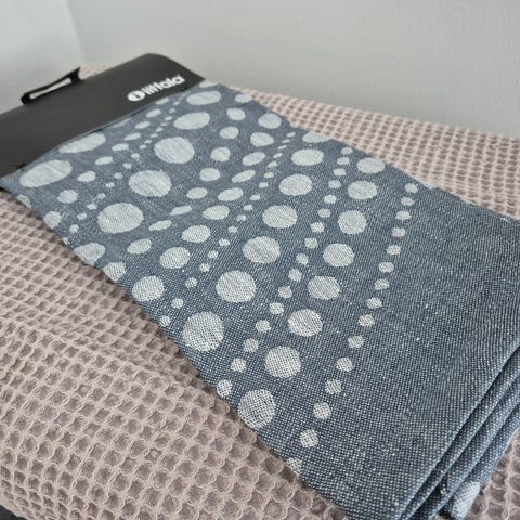 Iittalan Kastehelmi-sarjaan kuuluva vaaleanharmaa kaitaliina, mitat 44 x 144 cm. Materiaali 100% kudottu pellava.