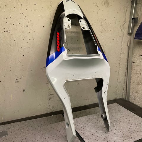 Lasikuituinen "Wes Cooley replica" GS 1000S Suzuki mallinen kate, maalissa muutamia pieniä halkeamia ja naarmuja.