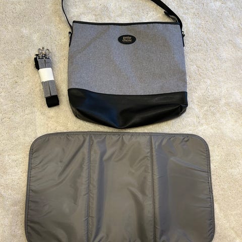 Petit Cherie fantasie musta hoitolaukku. Uudenveroinen. Sisällä paljon lokeroita, ja taiteltava hoitoalusta. Saa lyhyemmät hihnat myös, jotka saa kiini vaunuihin. Nämä tulevat laukun mukana, sekä paikalla oleva pitkä olkahihna.