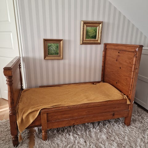 Sänky ei nykyisellään kestäne kovin suurta painoa, pohjaa kannattelevat tukilaudat on uusittu puulistoilla. Ne täytyisi vaihtaa tukevampiin, jos haluaa nukkumakäyttöön. Itse olen säilyttänyt sängyssä vain ylimääräisiä mattoja ja peittoja.
