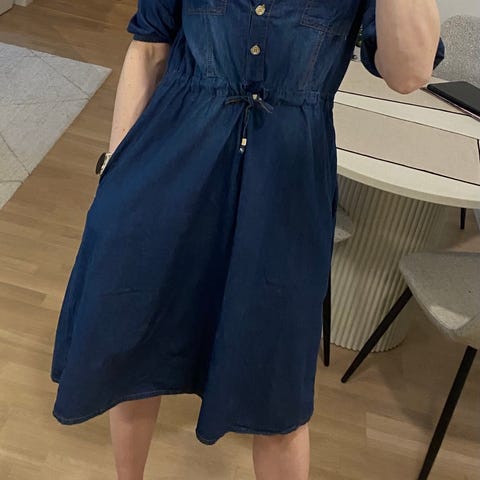 Kiva pitkä tummansininen denim-mekko, kai-kai 50 cm, olka-helma 130 cm, säädettävät olkaimet ja vyötäröllä solmiamisnauha.