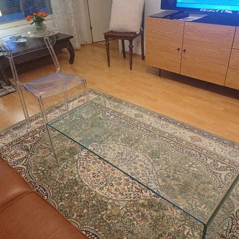 Hieno lasimosaiikkipöytä. Ei pärjää talvea pakkasissa, mutta kesällä terassilla tai puutarhassa.