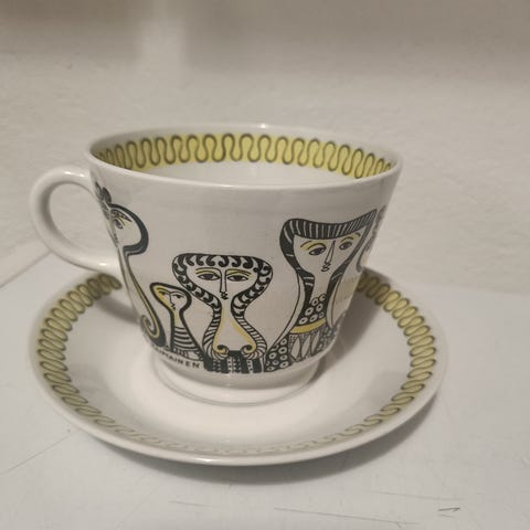 Tassin halkaisija 11 cm. Kupin korkeus 5 cm ja halkaisija 5 cm. Käsinpesu. Tee tarjous.