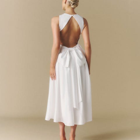 Chi Chi London kaunis häämekko. Kiinnitys takana olevilla napeilla. Koko UK 12, eli EU 40, eli noin L. Hyvässä kunnossa, mutta päällyskankaassa on pieni reikä. Tämä huomioitu hinnassa.