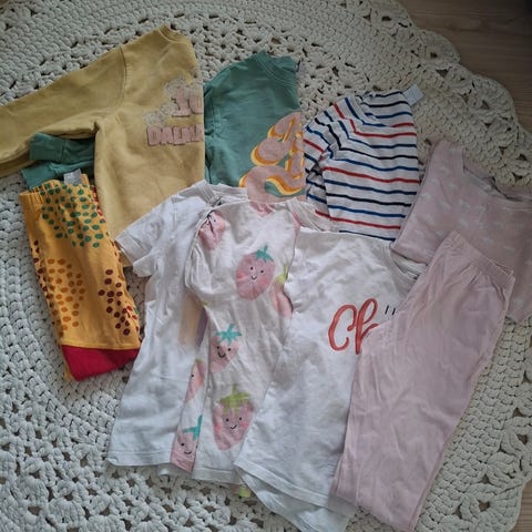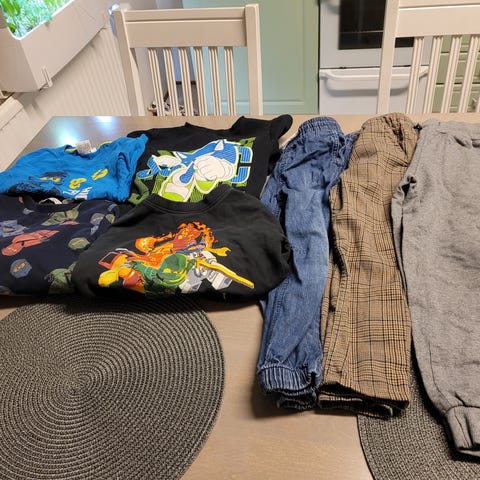 Pieni vaatepaketti koossa 110/116. Meillä olivat käytössä hoikalla 116-kokoisella.