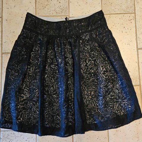 Almia merkkinen musta siisti vuorellinen hame kokoa 50. Materiaali paksuhkoa pellavaa. Sivulla vetoketju ja nappikiinnistys. Kaunis kellomainen helma.
