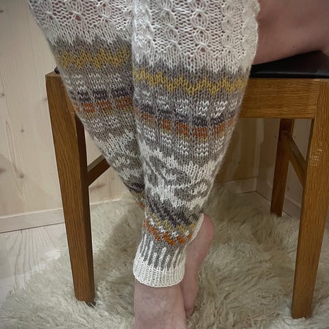 Seitsemän veljestä -langasta käsin kirjoneulotut säärystimet.