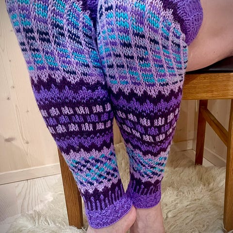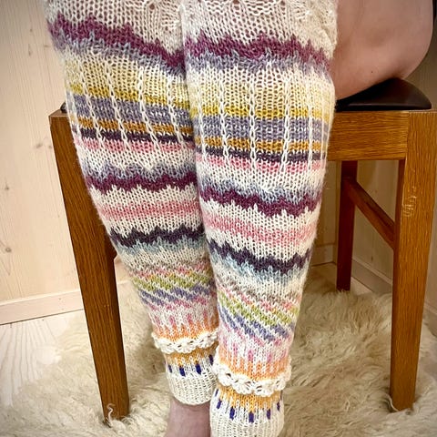 Seitsemän veljestä -langasta käsin kirjoneulotut säärystimet.