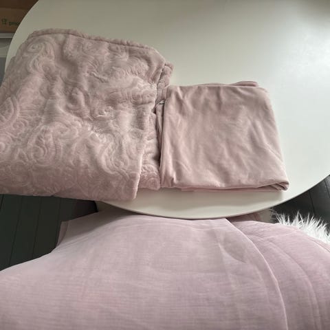 Kaksi tyynyä ja torkkupeitto joka toiselta puolelta pörröinen. 140*190cm peitto