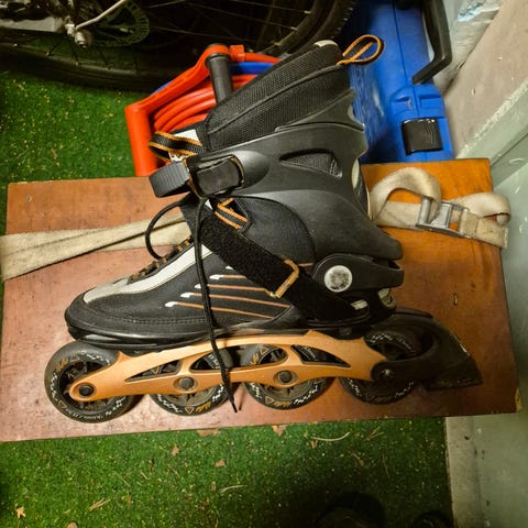 Vähän käytetyt rullaluistimet. Kuvissa näkyy renkaiden hyvä kunto ja jarrupalan kulumattomuus. Tarrat ehkät ja lukot toimivat.