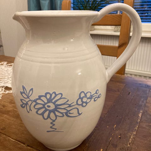 Keramiikkakannu, vetoisuus noin 6dl. Korkeimmillaan reilu 12 cm ja pisin leveysmitta noin 21 cm. Hiukan raidallinen lasitus, ei mitenkään fiinisti viimeistelty miltään osin, mutta jollakin kömpelöllä tavalla herkän kaunis. 🧡