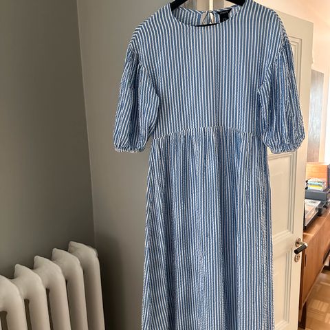 Ihana kevyt olkainmekko 30 % silkkiä, 70 % puuvillaa. Kai-kai 44 cm, olka-helma 128 cm, säädettävät olkaimet, alla vuorikangas polveen asti. Vaalea raita on auringonläikkä, ei tahra :)