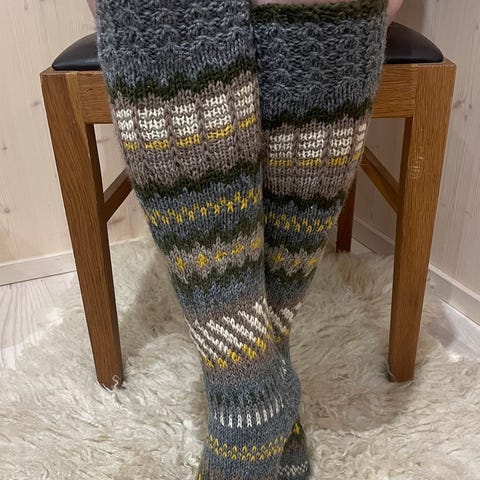 Kauniit ja lämpimät käsin 7-veljestä langasta, neulotut pitkävartiset kuvioneule villasukat omaksi tai lahjaksi.