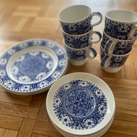 6 kpl Arabian Ali kahvikuppeja sekä kermakko ja sokerikko. Kaikki ehjiä ja hyväkuntoisia.