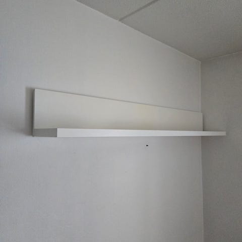 Koristeellinen seinähylly. Mustat kiinnikkeet ja rustikkinen puukansi.