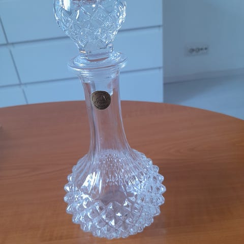 Ranskalainen karahvi erittäin kirkasta lyijykristallia. Uudenveroinen. Vetoisuus 750 ml, korkeus 28 cm ja halkaisija mahan kohdalta n. 13 cm.