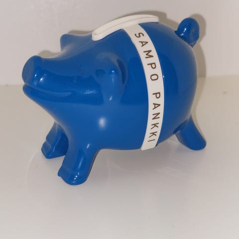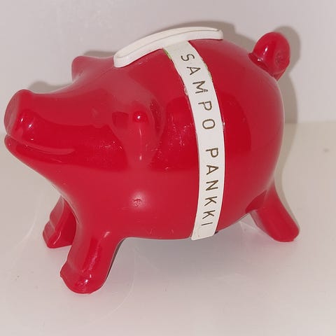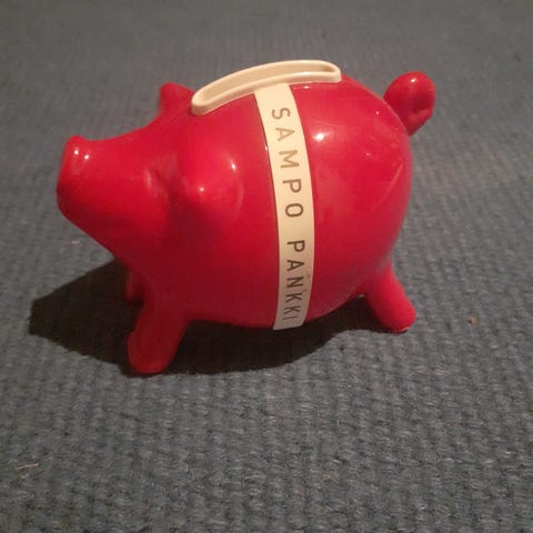 Siisti vaaleanpunainen Sampo pankin säästöpossu. Korkeus 10cm, leveys 9cm ja syvyys 14cm.