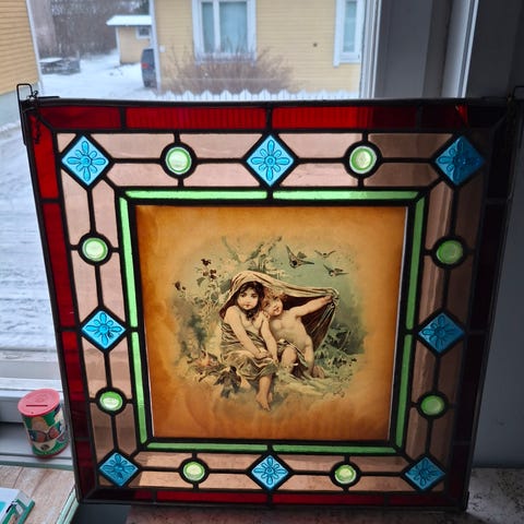 Ikkunaan ripustettava hieno lyijylasikoriste. Näyttävä isokokoinen 50x70 cm. Nouto, maksu käteisellä.