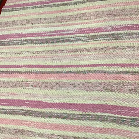 Pikkumatto tai muu sisustustekstiili käsinkudottua räsymattoa. Siistit, suorat reunat ja päissä hapsut. Tiivistä napakkaa kudosta.