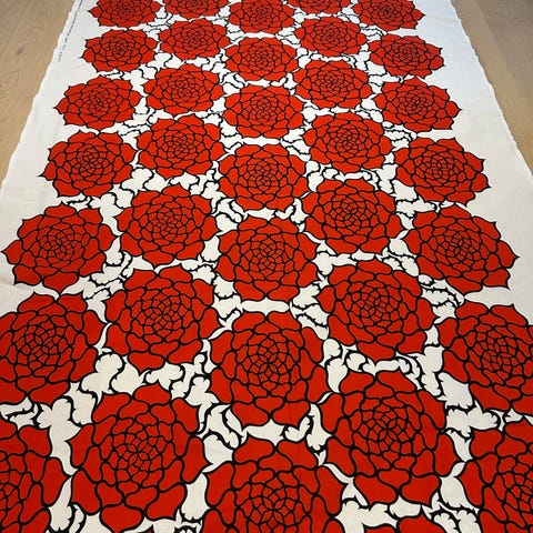 Marimekon harvinainen ja käyttämätön kangas. Ei ole ollut käytössä, kaapissa säilytetty. Koko 195cm x 150cm. Kankaan alareunassa n. 22 cm pelkkä musta osuus, jossa ei ole painokuviota. Suunnittelija Virpi Syrjä-Piiroinen, 1987.
