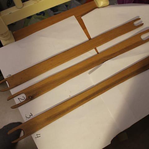 Kudontaan tarkoitetut sukkulat, joita voi käyttää myös sisustukseen. Molemmissa toimiva vieteri ja lankarullan pidike. Pit. 32,5 cm.