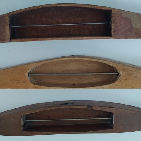 Kudontaan tarkoitetut sukkulat, joita voi käyttää myös sisustukseen. Toisessa toimiva vieteri ja lankarullan pidike. Toisessa lankarullan pidike on lukittu omalla pidikkeellä. Pit. 32,5 ja 31 cm.