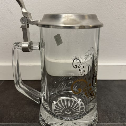 Alwe-merkkinen tinakannellinen lasituoppi Länsi-Saksasta. Etsatut metsä- ja hirvieläinkuviot. Siisti, kaivertamaton ja ehjä. Tilavuus 0,5 litraa.
