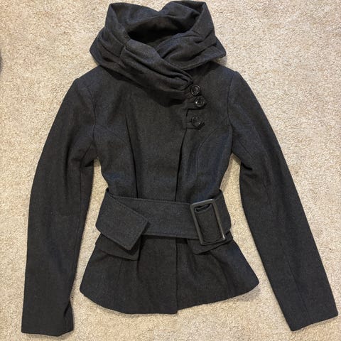 Vain muutamia kertoja käytetty, helposti kauluksen tyyliä muunneltava takki.