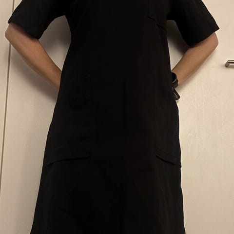 Malli on tyköistuva, mutta selkäpuolella (lapojen kohdalla) on taitokset, sekä helmassa halkiot, joiden ansiosta asu antaa myöten ja toimii hyvin ja on mukava liikkuvassa työssä. Asun / työpaidan koko vastaa mielestäni lapun kokoa.