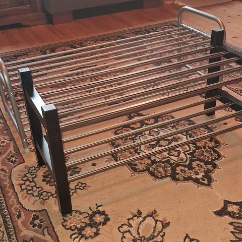 Metallinen kenkäteline, leveys 92 cm syvyys 35 cm korkeus 38.