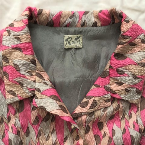 Kokolapussa lukee 040 / M. Mekko menee ehkä ainakin nykykokoon 38 asti, mutta tarkista varmuuden vuoksi mitat: rinnanympärys n. 99 cm, vyötärö n. 76 cm, lantio n. 102 cm, hartiat n. 42 cm, pituus olalta helmaan n. 97 cm.