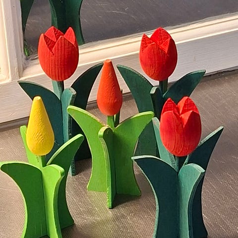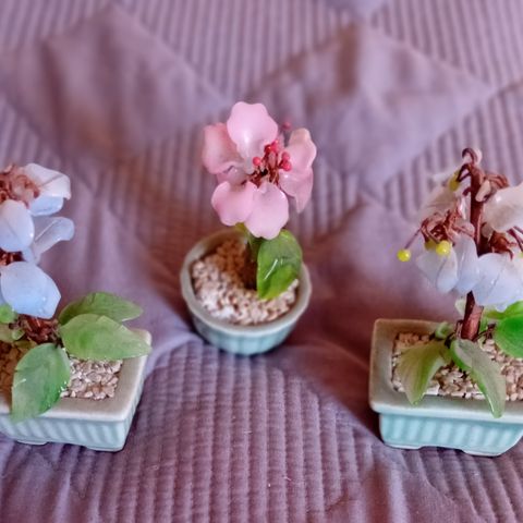 4 kpl puisia kukkia. 3 kpl tulppaaneja ja yksi kaktus. Kaikissa kukissa pientä kulumaa.