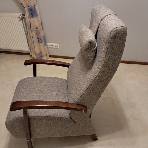 Myydään luonnonvaalea lepotuoli. Istuinosa nahkaa, siisti ja ehjä. Tausta keinonahkaa, nahka murentunut ylhäältä, ks. kuva. Myös kädensijojen alla nahka on murentunut. Tuolissa on hyvä istua.